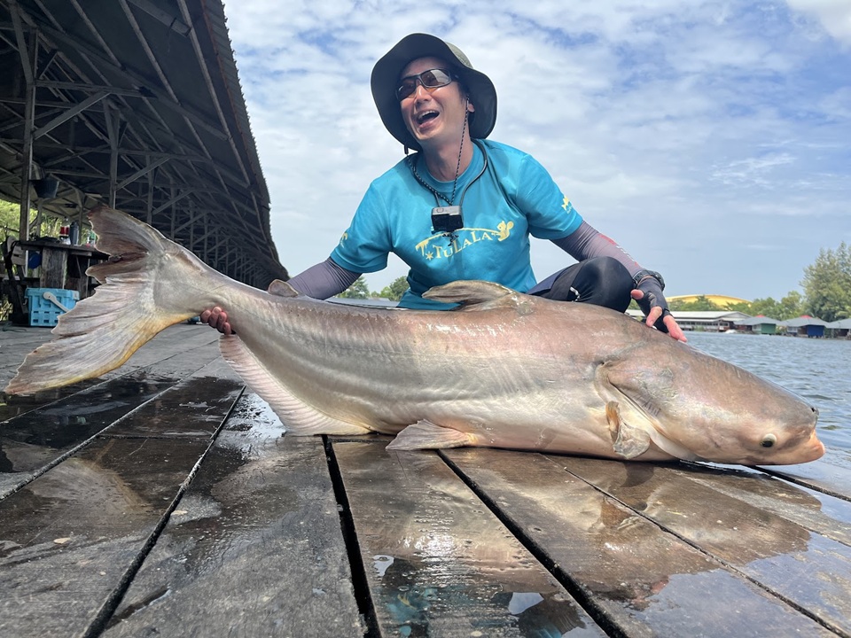 ここでは20kg超えが当たり前のメコンオオナマズやパーカーホを狙えます。ガイドがしっかり釣らせてくれるので安心ですが、掛けてからが本当に体力勝負!翌日はしっかり筋肉痛でした(笑)。日陰の桟橋でのんびり竿を出せるのも魅力ですね。(こちらは今回レンタルタックルで対応してます)