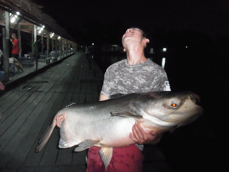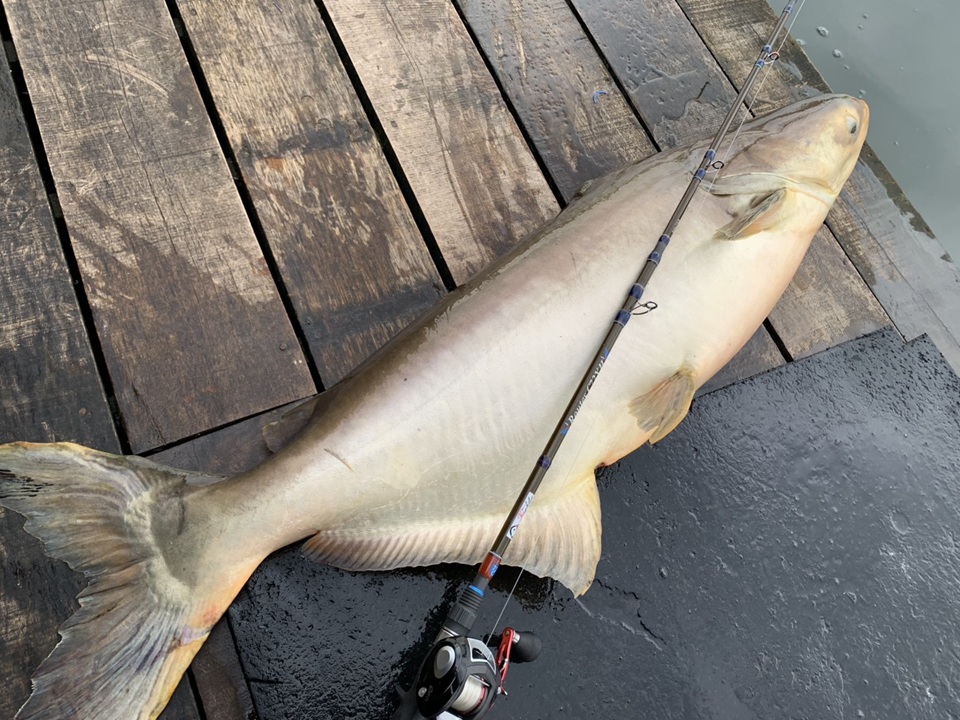 ブンサムランは30kgを超えるメコンオオナマズや、パーカーホ、その他パンガシウス系、ピラルク(たまに呼吸が見えるので多分いるはず)、トーマン(いるらしい)、ティラピア(イワシみたいに湧いてます)など多様な魚が狙えます。基本は餌でぶっこみ釣りとなります。
