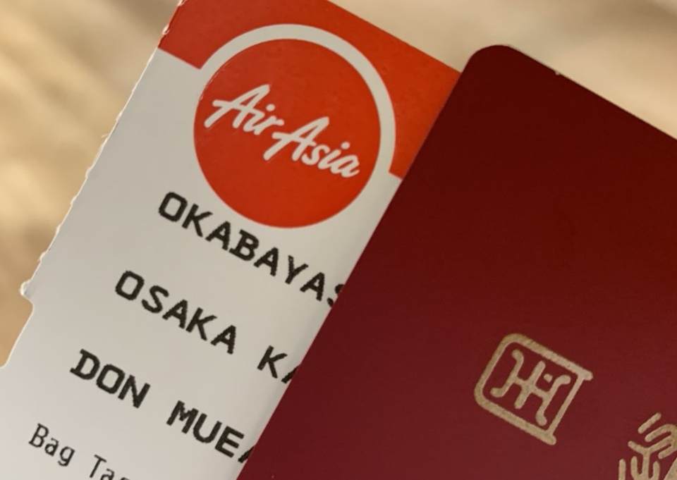 今回は関西国際空港発のエアアジアでバンコクへ向かいました。バンコクには大きく分けて「スワンナプーム空港」と「ドンムアン空港」の2つが国際線として機能しており、関空からはどちらとも発着があります。僕は関空からドンムアンへの往復航空券を取り、20kgの預け荷物の金額を含めるとおおよそ5万円後半のチケットとなりました。