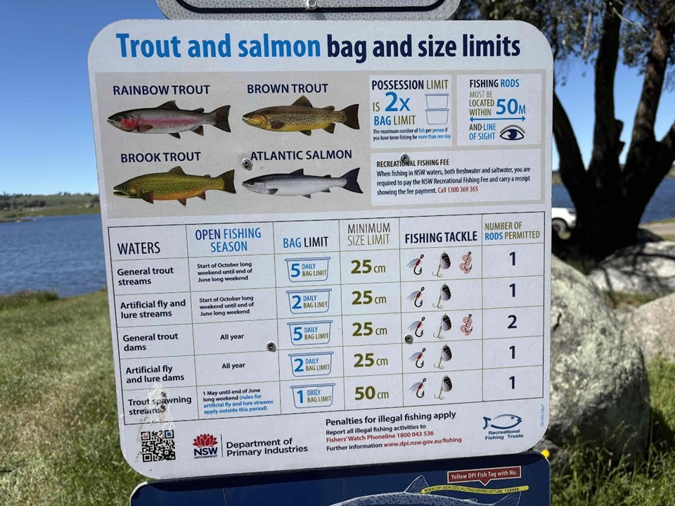 まず最初はシドニーから西へ進み、ブルーマウンテンを超えた先の「Oberon」という田舎でトラウトフィッシングに挑戦!※湖にはレギュレーションが書かれた看板があります。