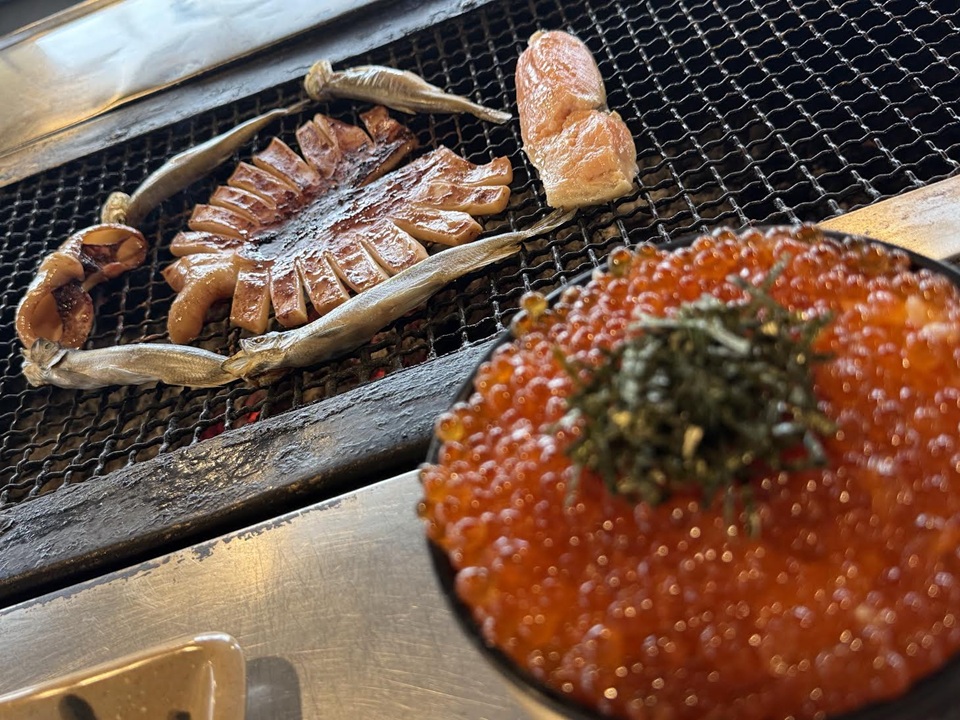 ↑炉端焼き。【喰処 鮭番屋】釧路発祥の炉端焼きをから楽しめるお店で、朝一番から順番待ちをするほどでした。いくら丼、トキシラズの塩焼き、イカの姿焼き、本ししゃも(雄雌)